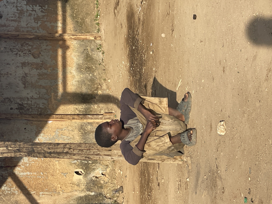- "A young, dark-skinned boy sits cross-legged on the ground next to a dilapidated wall" by FM-LCYzr2, licensed under CC BY 4.0