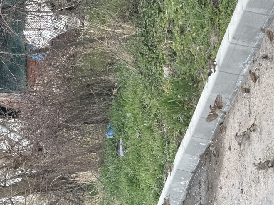 The image displays an outdoor scene in the city of Gorski Izvor, Bulgaria, characterized by a transition from a cleared ground surface to overgrown vegetation. In the foreground, a light-colored, coarse ground, possibly gravel or dirt, is occupied by approximately 15-20 small birds, identified as sparrows. One sparrow in the mid-left foreground is captured with its wings fully spread, indicating a moment of flight, landing, or aggressive display. A grey concrete curb, composed of segmented blocks, runs horizontally across the mid-ground, separating the foreground from a slightly elevated grassy verge. This verge is covered with vibrant green grass and various low-lying herbaceous plants. In the background, dense, predominantly bare deciduous trees and thorny bushes form a thick barrier. Visible within the vegetation are several discarded items, including a bright blue plastic container and a dark grey object resting on the grass. Partially obscured by the foliage, elements of man-made structures are discernible, including sections of a metallic mesh fence, a building wall with visible dark red bricks, a dark green structural component, and a blue tarpaulin. No human subjects are present in the scene.