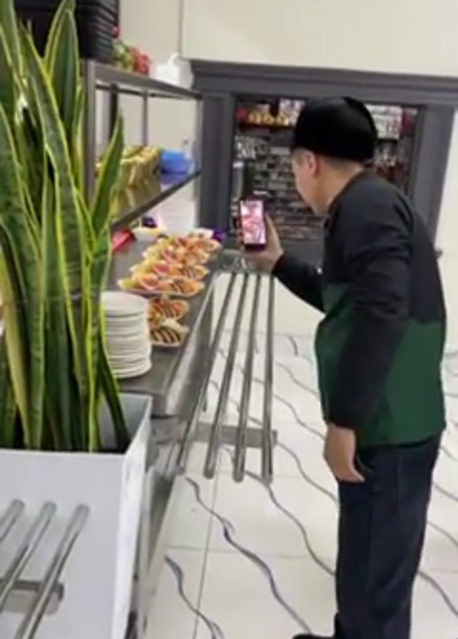A man in a black cap, jeans, and black and green jacket is standing in front of a metal buffet table filled with plates of fruit covered in chocolate sauce. He holds up his phone to take a photo or video of the food, with his phone screen visible. The buffet table is in a brightly lit room with a white tile floor and a dark gray buffet shelf behind it. A tall plant in a white planter is next to the buffet table.