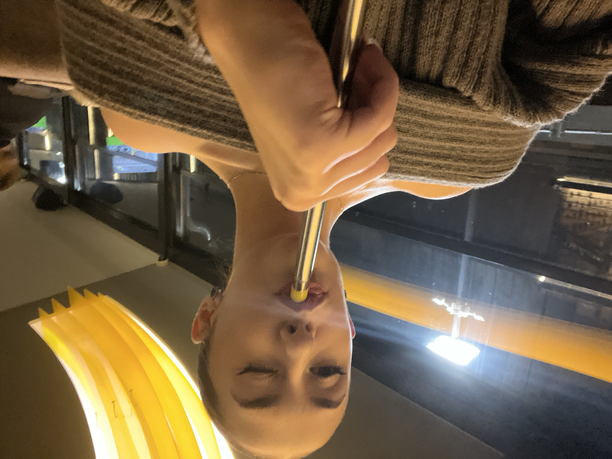 A woman is smoking a hookah. The image is taken from a low angle, looking up at the woman's face and the hookah pipe. The woman is wearing a gray sweater. The background is blurry but appears to be a window with lights outside. The location is possibly in the city of Sofia, Bulgaria.