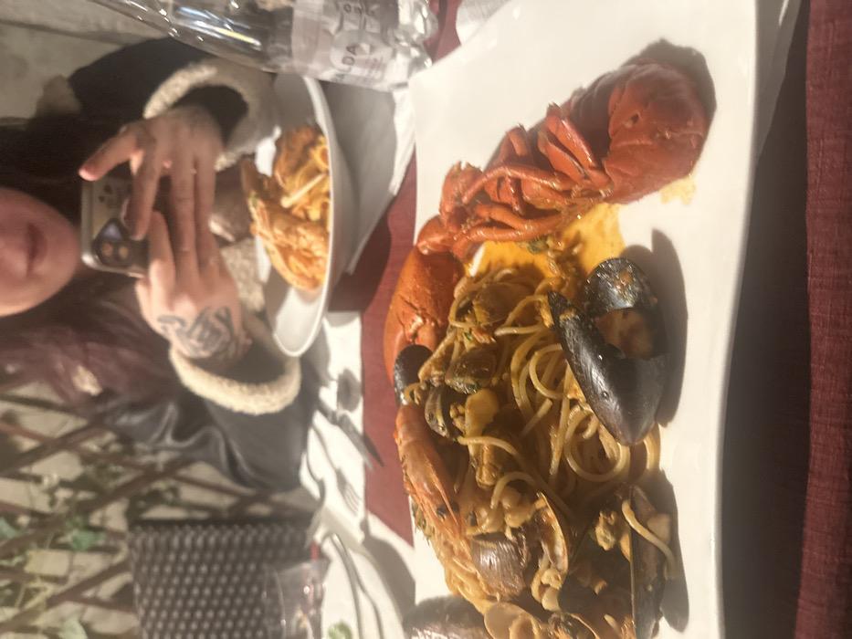 The image depicts an indoor restaurant dining scene in Venice, Italy. In the foreground, a large white rectangular plate holds a portion of spaghetti al frutti di mare. The pasta is mixed with a reddish-orange sauce and various seafood components, including a cooked half-lobster (split lengthwise), multiple dark-shelled mussels, light-shelled clams, and at least one large cooked shrimp. The table is covered with a dark red tablecloth. To the right of the main dish, a clear plastic bottle of "ALDA" brand water is visible. In the background, a second, round white plate contains another pasta dish, likely featuring large prawns or shrimp. Silverware, including a fork and knife, is positioned on the tablecloth. A person with long, dark hair and extensively tattooed arms is seated behind the table. They are wearing a dark jacket with a light-colored, possibly shearling, trim. The person's face is largely obscured, but their hands are actively engaged with a dark-colored smartphone, holding it vertically with thumbs on the screen. The background shows a decorative, trellis-like structure with faint green foliage, suggesting a wall or partition within the dining establishment. The lighting is dim, indicative of an evening setting.