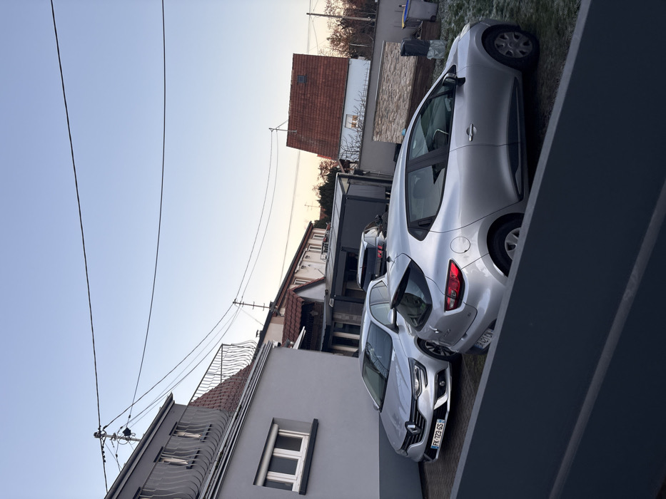 The image portrays a residential property in Ostwald, France, under a clear, pale blue sky transitioning to a lighter hue near the horizon, indicative of low sun angle. Patches of frost are visible on the ground. In the immediate foreground, a dark grey barrier partially obscures a silver Renault Clio four-door hatchback, positioned facing right. Its French license plate, `FK-421-EK`, is partially discernible. Immediately behind it, a silver Renault Mégane four-door hatchback is parked facing left, displaying the French license plate `FK-723-GS`. To the left of the vehicles stands a light grey two-story house featuring white-framed windows, one equipped with a rolling shutter, and an upper-level balcony with an ornate wrought-iron railing. Behind the Mégane, a dark-colored SUV is partially visible, parked adjacent to a modern, dark-framed outbuilding or extension. The background reveals multiple residential buildings with traditional red-tiled roofs, including a distinct white-walled house with a steep roof positioned behind a two-tiered, light-colored stone-clad wall on the right. Numerous dark electrical or communication lines crisscross the sky above the structures. No individuals are present in the scene, and no overt actions or interactions are depicted.