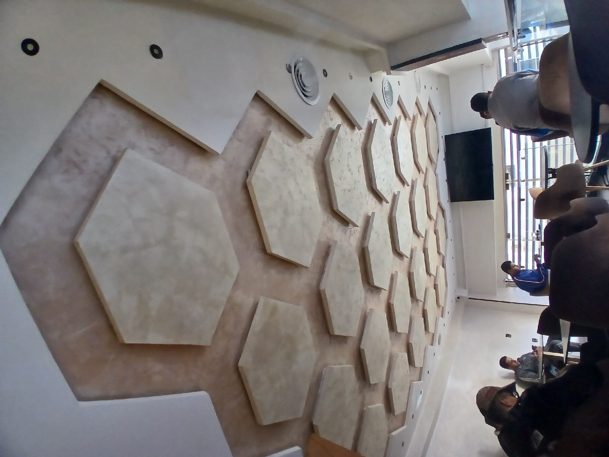 The photograph depicts the interior of a building in Meknes, Morocco, characterized by a wall decorated with hexagon-shaped panels. The panels appear to be made of a light-colored material. Black ventilation ducts are visible in the upper section of the wall, which is light in color. The room features a modern design, with a dark rectangular screen mounted on a side wall. Multiple people are visible in the room. At least four are sitting on chairs. One is seated at a table. The scene appears to be a contemporary office or meeting space in Meknes.