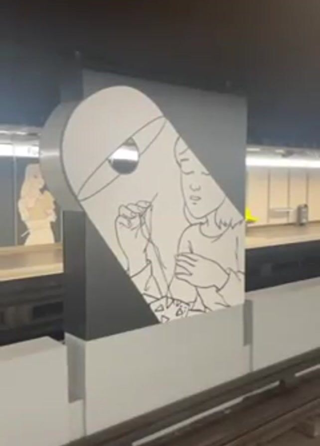 subway station. A black and white drawing of a person under a lamp is displayed on a support structure. A subway train arrives, with the driver visible in the front window. The train doors open, revealing a crowded interior.