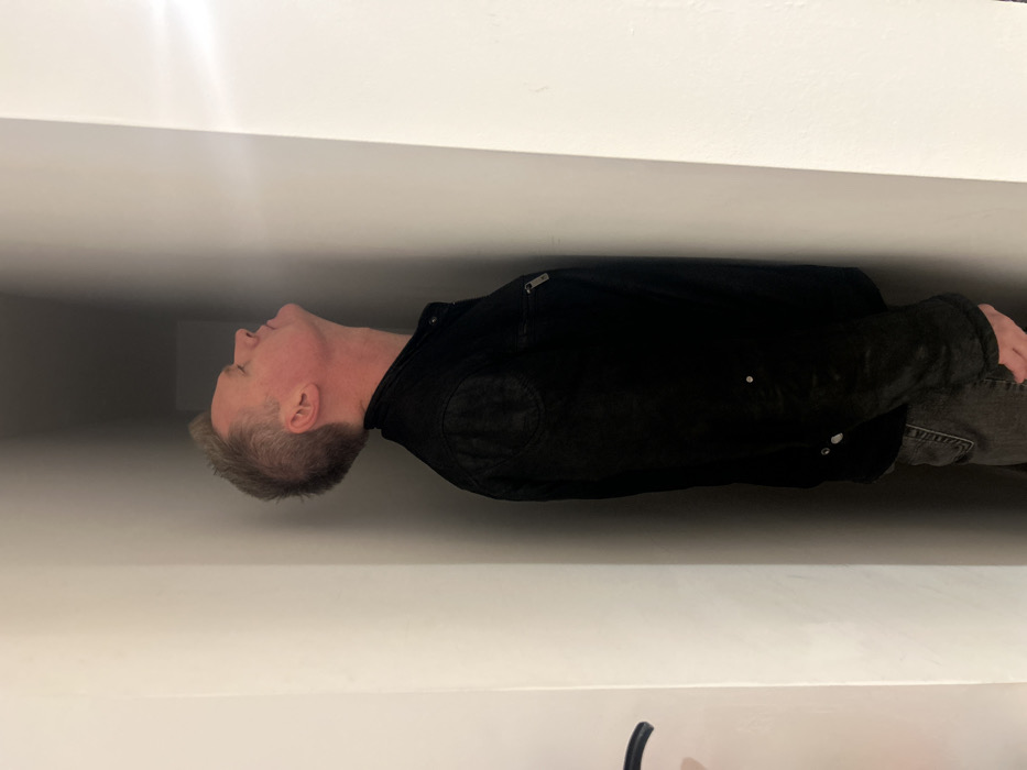 A man lies horizontally within a white, rectangular space resembling a shelf or narrow passage