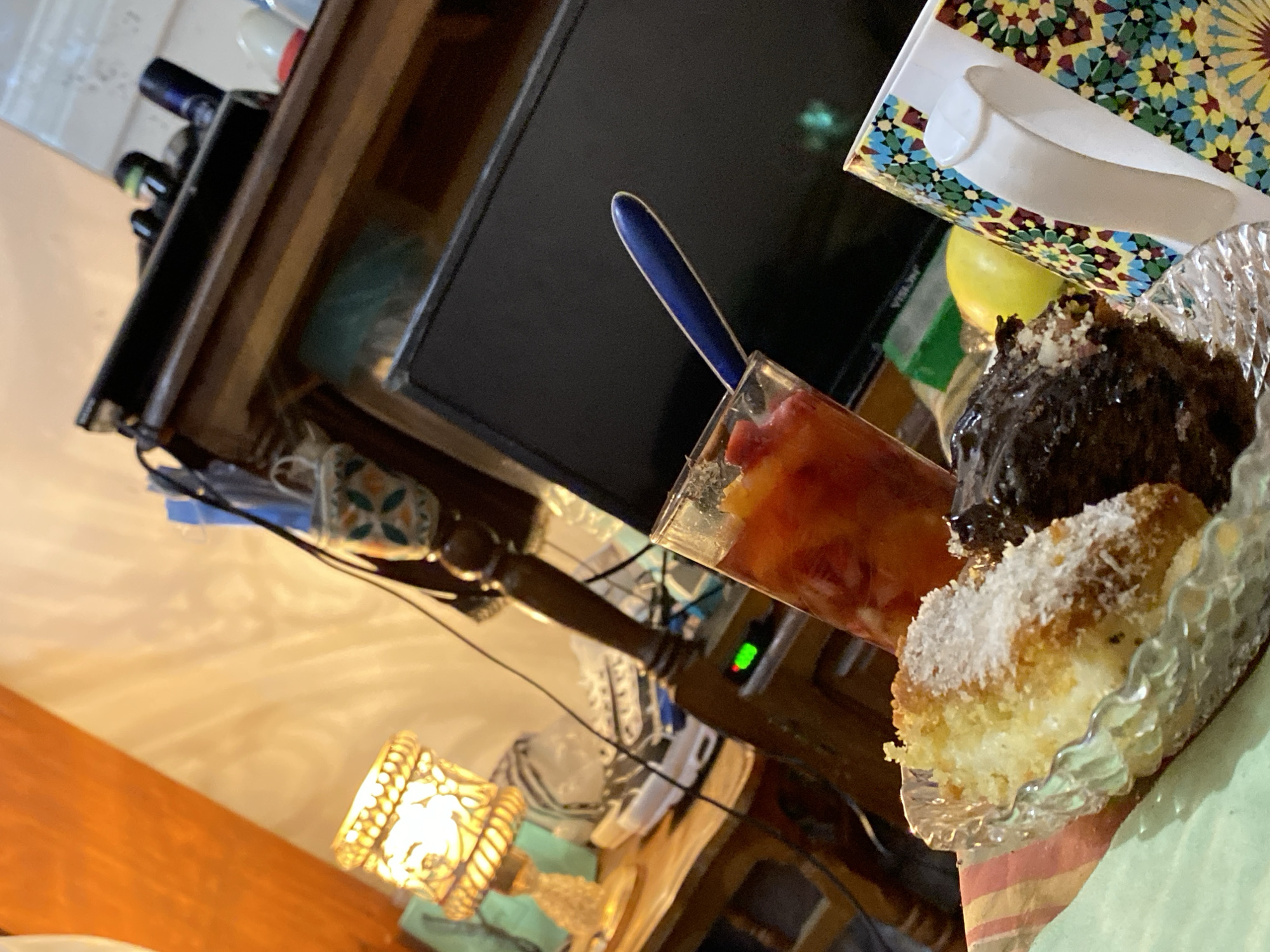 This image depicts an indoor scene in Ouislane, Morocco, centered on a casual arrangement of food and drink. In the foreground, two pieces of cake are presented in a clear glass dish on a striped and green patterned surface. The piece on the left is a light-colored cake topped with shredded coconut. The piece on the right is a dark, possibly chocolate, cake, resting on crumpled silver foil. To the right of the cakes, a white mug with a multi-colored geometric mosaic (zellige-style) pattern is partially visible. Behind the dark cake and mug, a yellow fruit, possibly a lemon, is present. To the left of the cakes, a clear glass contains a red-orange liquid with visible fruit pieces, consistent with a fruit beverage, and a blue spoon is submerged within it. In the midground, a dark-screen television or monitor is positioned behind the drinks and cakes. To the left of the television, a wooden side table or shelf holds a lit decorative lamp with an ornate, possibly brass and glass, shade. Behind the lamp, a pair of white and grey sneakers are visible. Adjacent to the lamp, a tall, carved wooden stand with a patterned base (blue and white geometric design) is present. A green LED light is visible on an electronic device situated on the wooden table. The background reveals an upper wooden shelf or dresser holding various indistinct objects, including bottles or containers. Orange curtains are partially visible on the far left, and a light-colored wall forms the backdrop. Cables are discernible, indicating powered electronics. The overall lighting is warm, emanating from artificial sources, including the decorative lamp.
