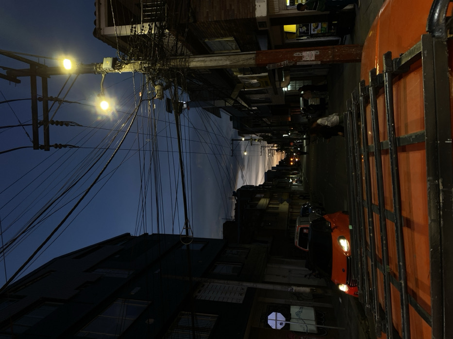 A narrow street view between dark buildings at dusk or dawn. Overhead power lines create a tangled web above. Orange vehicles line the right side of the street, their headlights reflecting in the wet pavement. Streetlights cast a glow over the scene, highlighting the narrow passage and the buildings that line it. The sky is a gradient of blue and orange, a sliver of light on the horizon.