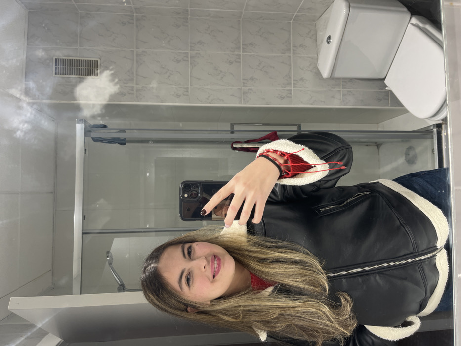 In a bathroom, a person takes a mirror selfie. The person is wearing a black leather jacket with a white furry lining. Their hair is long and blonde. They are holding a phone with a black case. In the background, there is a toilet, tile walls, a shower stall with a glass door, and a vent. Some steam is visible near the vent.