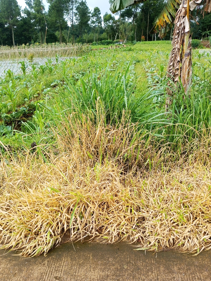 The scene depicts an agricultural area in Kondha, India. The immediate foreground shows a concrete surface. Directly above, a dense strip of dried, light-yellow grass extends horizontally, gradually blending into taller, vibrant green vegetation. The midground contains a cultivated field with rows of young corn plants and other broad-leaf green crops. To the left, a section of the field is waterlogged, featuring numerous thin, vertical stakes supporting growth. To the right, a banana tree with a brown, dry trunk and some green leaves is prominent, flanked by tall, dense green grass. The background consists of a thick line of tall, slender evergreen trees set against an overcast sky. No individuals or specific actions are present.