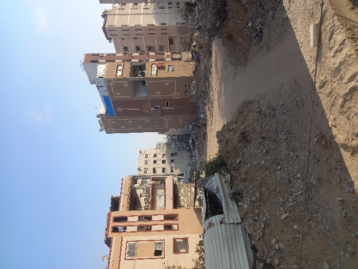 The image displays a severely damaged urban environment in Khan Yunis, Palestinian Territory, under a clear blue sky. An unpaved dirt path occupies the center of the foreground, leading into the midground. To the left of the path, a substantial mound of soil mixed with concrete fragments and rubble is visible. Behind this, a crumpled, light-colored corrugated metal sheet structure lies partially collapsed. The lower right foreground reveals a sandy concrete ledge, with a small white block resting on its surface. A dark wire or cable stretches across the lower frame. In the midground, two multi-story buildings stand prominently, exhibiting extensive structural damage. The building on the left, a light brown hue, shows multiple exposed interiors through large gaps in its facade and dark, empty window openings. The taller building on the right, predominantly dark brown with lighter decorative patterns and a star-like emblem on its upper-mid section, has significant portions of its exterior walls missing, revealing internal floors and structural elements. Its roof area also appears damaged, with a section of blue material visible. The ground between and surrounding these buildings, extending into the background, is covered with extensive piles of debris, including concrete rubble, twisted metal, and shattered building materials. Additional damaged and partially destroyed buildings are visible in the hazy background. No individuals or discernible activities are present in the scene.