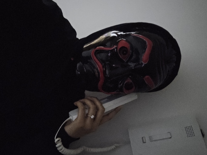 A person wearing a black mask with red markings is shown holding a white telephone receiver