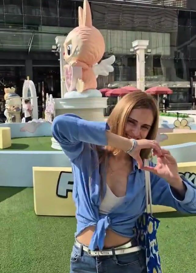 woman in front of a "Finding Mokoko" pop-up display. The woman has long brown hair and is wearing jeans, a white top, and a blue button-down shirt tied at the waist. She is smiling and posing for the camera, with her arms outstretched and then making a heart shape with her hands. Behind her is a cartoon rabbit figure, a small castle-like structure, and a sign that says "Finding Mokoko". The display also includes other colorful shapes and figures. In the background, there are buildings, a large screen, and trees. The overall environment appears to be an outdoor shopping or entertainment area.