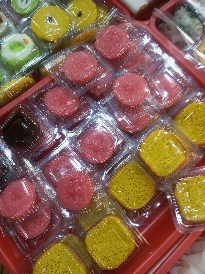 - "The image displays a dense arrangement of assorted Vietnamese desserts, individually sealed in clear plastic clamshell containers, situated on a red plastic tray" by FM-j17N03, licensed under CC BY 4.0