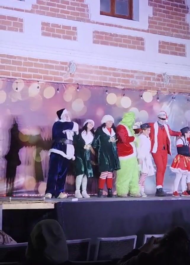 group of people dressed in Christmas-themed costumes waving to an audience. The individuals on stage appear to be dressed as Santa Claus, elves, and the Grinch. The backdrop features a decorative wall with Christmas lights, which suggests a holiday event or performance. The audience is seated and watching the show. The setting seems to be an outdoor stage.