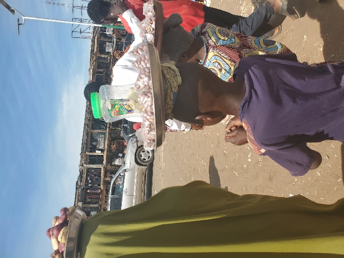 The image captures a sunlit street scene in Jos, Nigeria, depicting individuals engaged in street vending