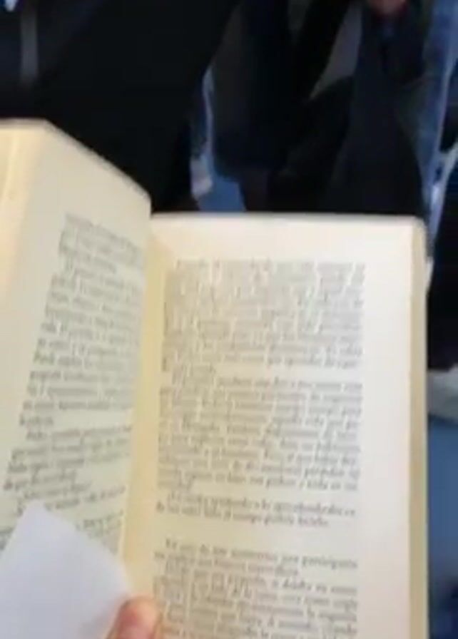 book held open in front of the camera, while the camera pans up to show a crowded bus or train. A page marker sticks out from the book. The book is written in Spanish. The camera moves upward, showing several people standing and holding onto overhead bars. The people are dressed in casual clothing.
