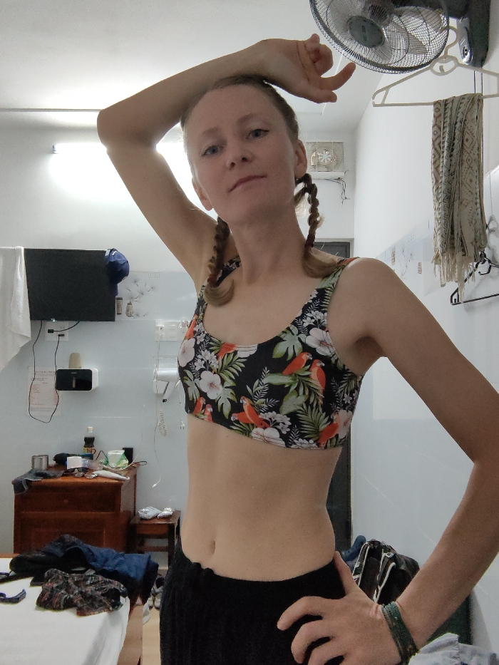 An individual stands facing forward in an interior room located in the city of Quảng Ngãi, Vietnam. The person is a fair-skinned female with light-colored hair styled in two twisted pigtails, looking directly at the camera with a neutral expression. She is wearing a black crop top with a tropical pattern depicting red parrots, green leaves, and white flowers. Her lower body is clad in black pants or shorts. Her right arm is raised with the hand resting on the top of her head, fingers slightly splayed. Her left hand is positioned on her hip. A multi-strand bracelet, appearing to be green and dark-colored, is visible on her left wrist. The room's walls are light-colored. A white oscillating wall-mounted fan is located in the upper right corner, and a white wall-mounted air conditioning unit is positioned to its left. A horizontal fluorescent light fixture illuminates the upper left wall. A flat-screen television is mounted on the left wall, with a white shelf below it holding a black electronic device and a small potted plant. Associated cables are visible. A wooden chest of drawers is situated in the lower left, its top surface cluttered with bottles, a metal cup, and a small dish. Clothing items are present on a surface in front of the dresser. Two white plastic hangers are affixed to the wall to the right of the fan, with a light-colored, patterned, fringed fabric draped over one. A small wooden stool is partially visible below the hangers. The room exhibits visible clutter.