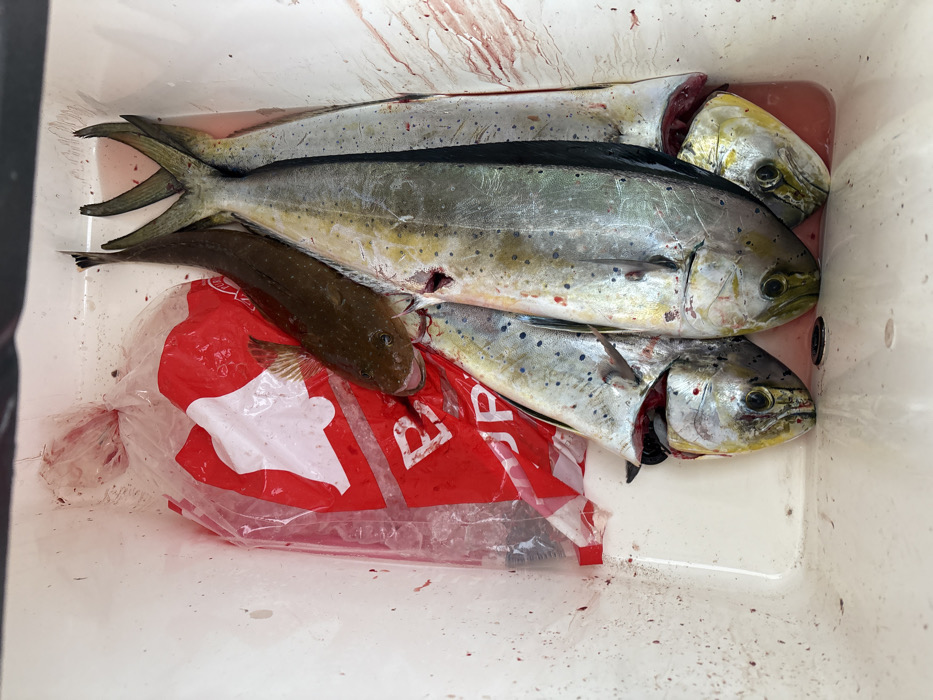 Three headless mahi-mahi fish lie in a white cooler, along with a brown fish with a mottled pattern