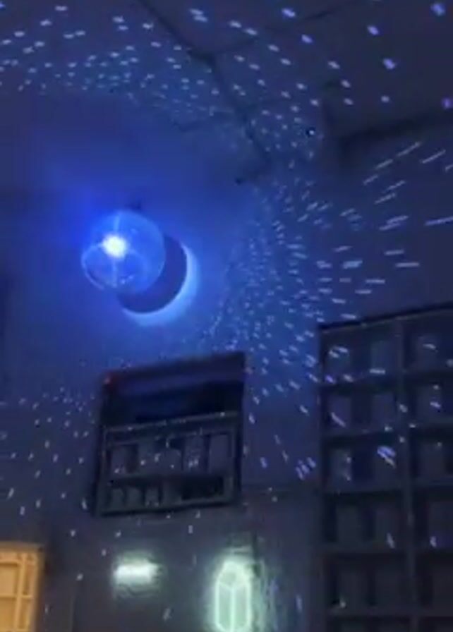 interior of a bar or restaurant. A disco ball hangs from the ceiling, casting blue light spots across the walls and ceiling. People are sitting at tables, and shelves stocked with items line one wall. A neon light in the shape of a milk carton is also visible.