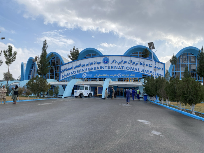 The image displays the exterior of Ahmad Shah Baba International Airport in Kandahar, Afghanistan