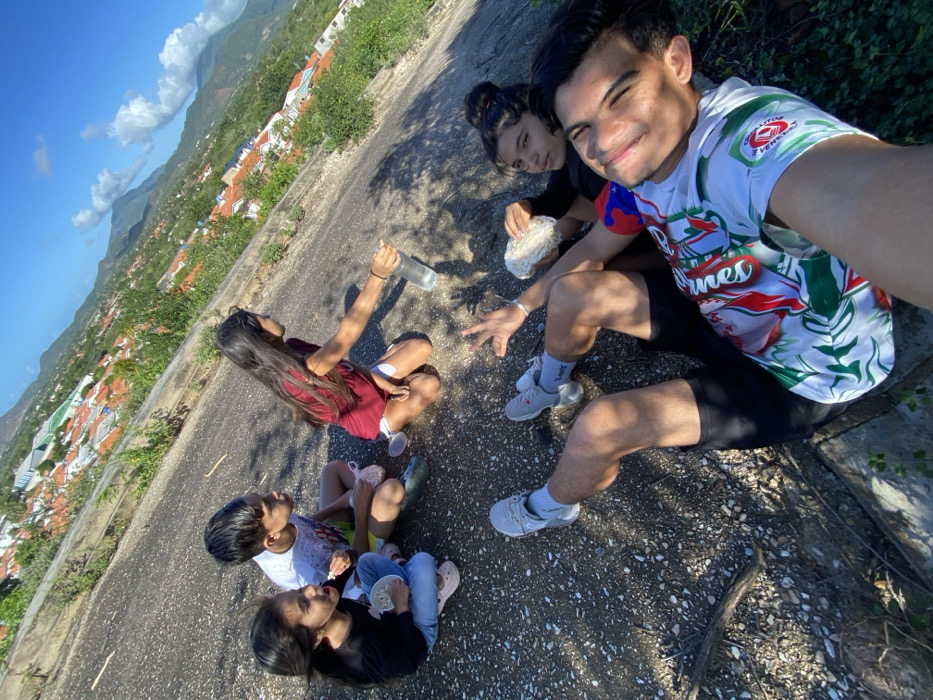 Five individuals are captured in a high-angle, sunny outdoor shot. A young man in a patterned shirt and black shorts appears to be taking a selfie with another individual sitting beside him who is holding a packet, while three others are sitting across them. One is holding a water bottle, and the other two appear to be eating out of small bowls. The background includes a view of a city with trees and mountains. The photograph appears to be taken on a slanted surface that is adjacent to some grassy overgrowth.