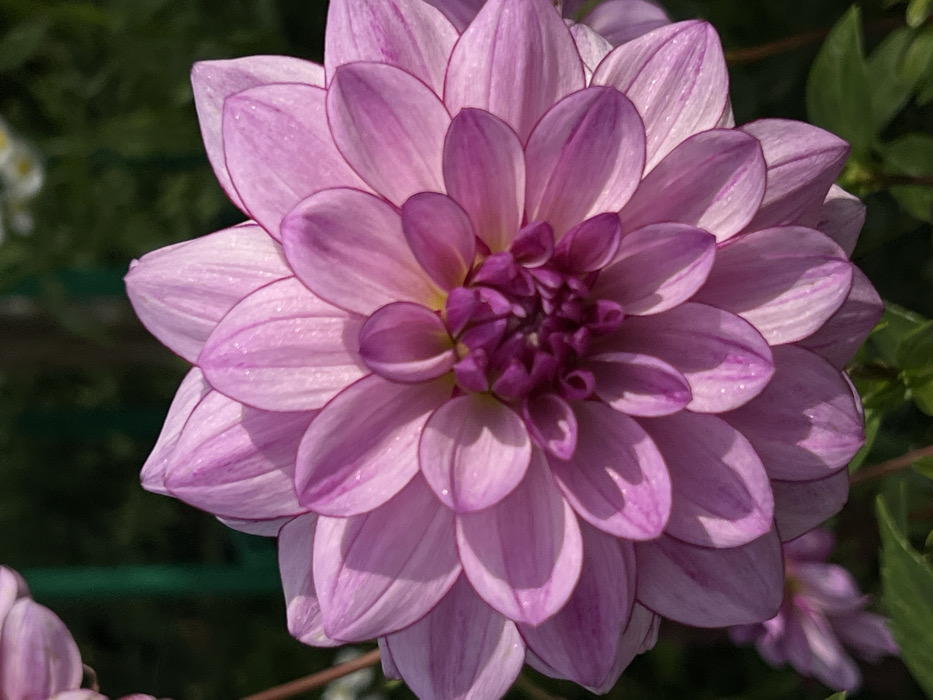 A close-up, eye-level photograph features a single dahlia flower positioned centrally. The dahlia displays numerous densely packed petals, ranging in color from light pink and lavender on the outer layers to darker fuchsia and magenta in the tightly clustered central florets. Fine striations are visible on the petal surfaces, which also bear multiple small, clear water droplets. Direct sunlight illuminates the flower, creating distinct shadows among the overlapping petals. The background consists of out-of-focus dark green foliage, with blurred hints of pale flowers in the upper right and lower left, and a thin, dark green vertical element partially visible in the upper left. This scene is located in the city of Giverny, France.