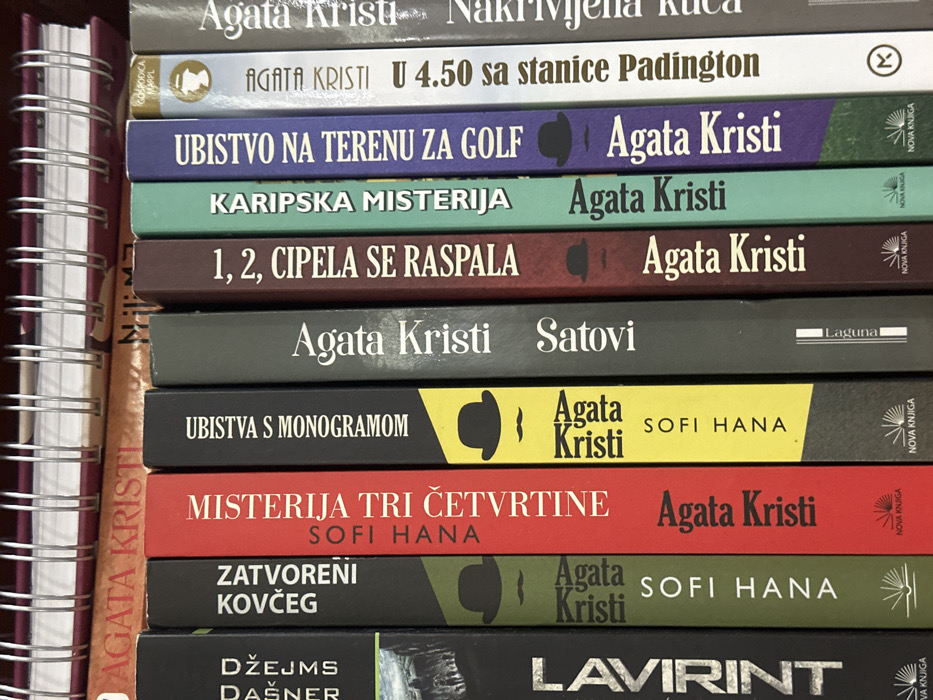 - "This image depicts a close-up, top-down view of a bookshelf containing a row of hardcover books, primarily detective novels, in an indoor setting within the city of Podgorica, Montenegro" by FM-QRd2i1, licensed under CC BY 4.0
