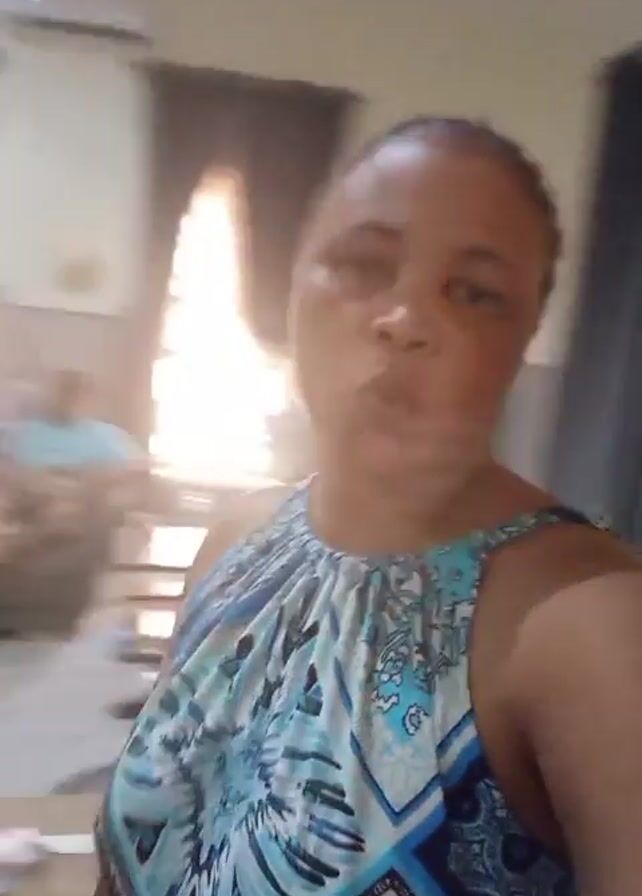 A woman is standing indoors, looking directly at the camera and making facial expressions. Her hair is braided back. She wears a sleeveless top patterned with blue and white designs. It appears as though she has bruises around her eyes. A television and sofa are in the background. She smiles.