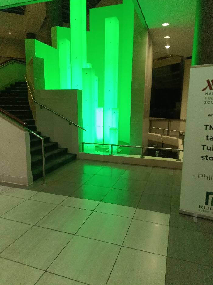 n indoor space illuminated with green lighting. A staircase ascends alongside a decorative arrangement of vertical light panels. Light reflects on the tile floor. In the background, a multi-level structure with metal railings is visible through an opening. A banner with logos and text occupies the right foreground.