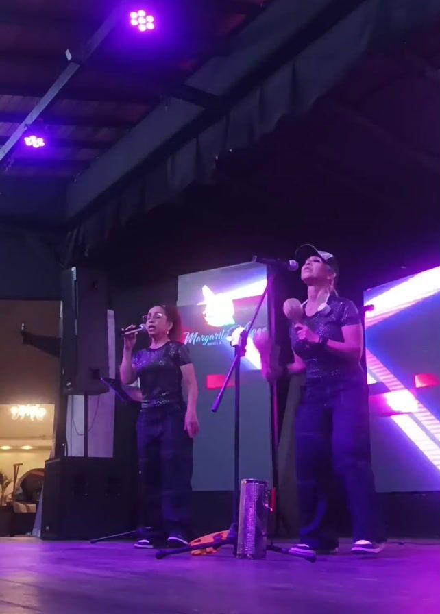 Two women perform live music on a stage. The woman on the left wears glasses, a sparkling top, and loose pants. She sings into a microphone. The woman on the right wears a baseball cap, a sparkling top, and loose pants. She plays maracas. Behind them is a screen that shows "Margarita Village, Hotel & Resort." The stage is lit with purple lights, and there's a wooden ceiling above. There are musical instruments on the stage floor. A chandelier can be seen in the background.