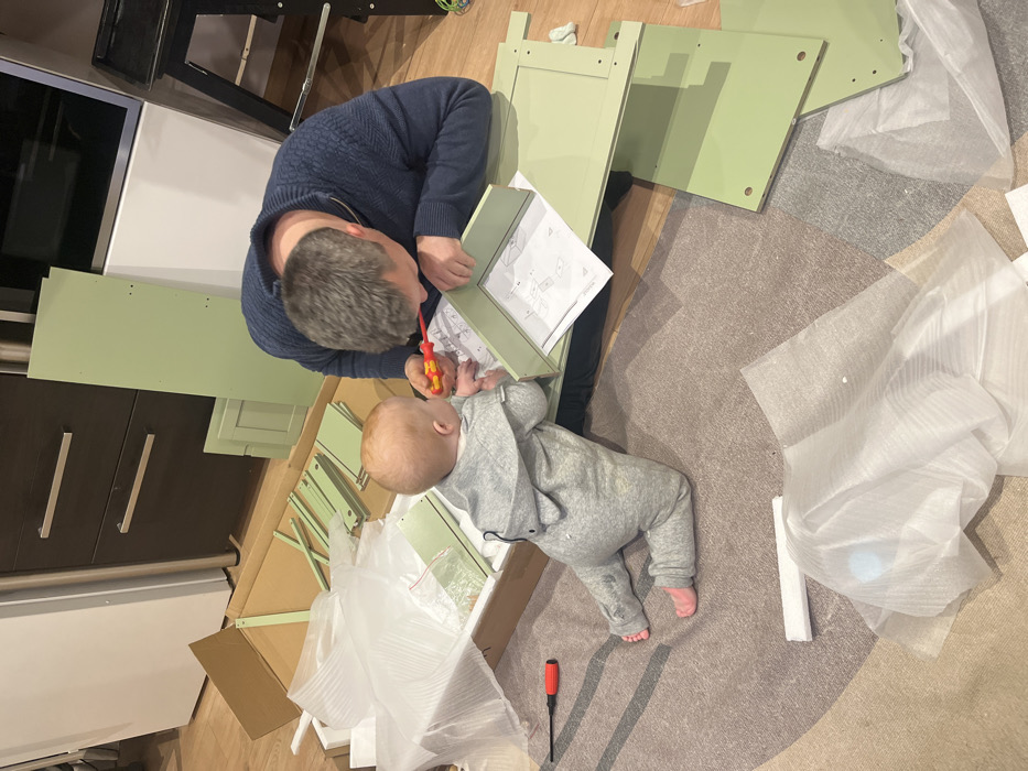 The image depicts an indoor domestic scene in the city of Gangloff, Germany, featuring an adult male and an infant surrounded by flat-pack furniture components