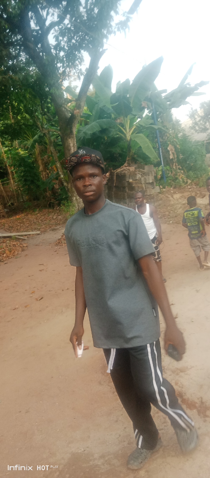 A young man stands outdoors wearing a dark cap, gray t-shirt, and black track pants with white stripes. He holds a small white object in one hand and a dark object in the other. Other people stand in the background, including one in a white tank top. Lush greenery surrounds the scene with trees and banana plants visible. The ground appears to be dirt or sand. "Infinix HOT PLAY" is displayed at the bottom left of the image.