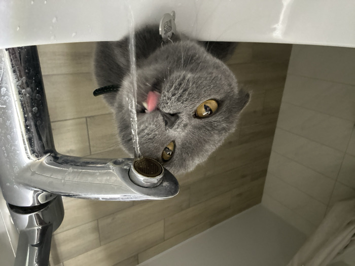 - "The image displays a grey-furred cat actively drinking water from a chrome-plated faucet" by FM-bCr7q2, licensed under CC BY 4.0
