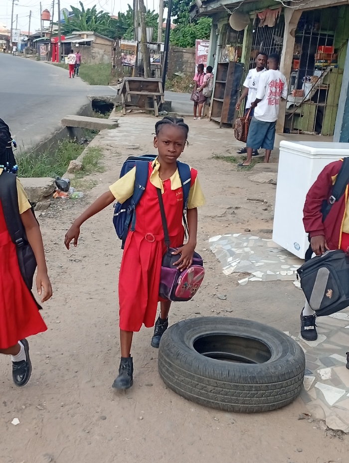This image depicts an outdoor street scene in Aba, Abia State, Nigeria. In the foreground, a young girl, appearing approximately 8-12 years old, stands centrally, looking directly at the viewer. She wears a red uniform dress with a yellow collar, a blue school backpack, and black boots. She carries a purple and pink lunch bag in her right hand. Her hair is styled in cornrows. To her immediate left, another child, mostly obscured, wears a red uniform dress, black loafers, and a black backpack. To the central girl's right, a third child, largely obscured, is visible wearing a red uniform top and black shoes with "Puma" branding. A dark-colored vehicle tire lies flat on the dirt ground in the mid-foreground, positioned to the right of the central girl. The ground in the immediate foreground is uneven dirt, transitioning to a paved asphalt road further back. A narrow concrete drainage ditch with a small concrete slab bridge runs along the left side of the dirt path. In the mid-ground, to the right, a light green and white commercial building with a corrugated metal roof, possibly a shop, features barred windows and displays. Two adult males stand outside this building; one in a white t-shirt and dark shorts holds a brown duffel bag, while the other, in a white t-shirt with red text on the back ("FIGHT FOR THE TRUTH") and blue shorts, faces him. Two other young girls in pink uniforms are partially visible standing near the shop's entrance. A white, freestanding freezer unit is positioned on the far right edge of the frame, next to the shop. The background reveals a street extending into the distance, lined with various buildings, some appearing residential and others commercial, alongside utility poles and power lines. Sparse green vegetation, including trees and bushes, is visible behind the structures. Two additional individuals are seen walking away from the camera on the paved road in the far background. A water tank on a raised stand is visible in the upper left background.