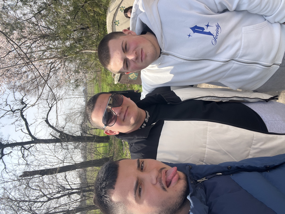 A full-frame, daylight photograph depicts three young adult males posing for a selfie in an outdoor park-like environment in Stara Zagora, Bulgaria. The male on the viewer's left, with short dark hair and facial stubble, wears a blue and dark blue puffer jacket and extends his tongue towards the camera. The central male, with short dark hair, wears large aviator sunglasses, a black long-sleeved shirt with "Los Angeles" text visible on the collar, and a black and white color-block puffer vest; he exhibits a faint smile and has his right arm draped over the shoulder of the male to his right. The male on the viewer's right, with a buzz cut, wears a white zip-up hooded sweatshirt featuring a blue "P Society" logo on the left chest; he presents a neutral facial expression and has his left arm draped over the shoulder of the central male. The background features numerous deciduous trees, some displaying light pink blossoms and others still bare, set against green ground cover under a clear, light blue sky. A low, curved, tiled structure adorned with geometric patterns in light yellow, green, and blue is visible behind the subjects on the right. A fourth individual, partially obscured, is visible behind this structure.