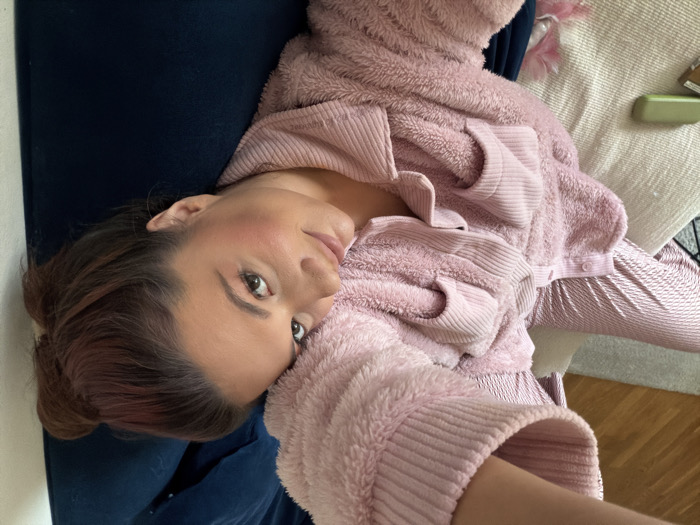 The image displays an adult female positioned supine, oriented towards the camera. Her head rests on a dark blue fabric surface, consistent with a sofa or bed. The subject's torso and lower body are supported by a light-colored, textured fabric, possibly a blanket or sheet. She wears a two-piece set of light pink loungewear, comprising a fuzzy, long-sleeved top with a collar and front buttons, and matching textured pants with a buttoned waistband. Her hair, reddish-brown, is pulled back into an updo. She exhibits facial makeup, including visible eyeshadow, blush, and lip color, and maintains eye contact with the camera. Adjacent to her right arm, on the light-colored fabric, a light green rectangular object, a smaller unidentifiable light object, and a pink fluffy item are visible. In the background, a wooden floor with a patterned design, possibly herringbone, indicates an indoor residential environment. This scene is located in Belgrade, Serbia.