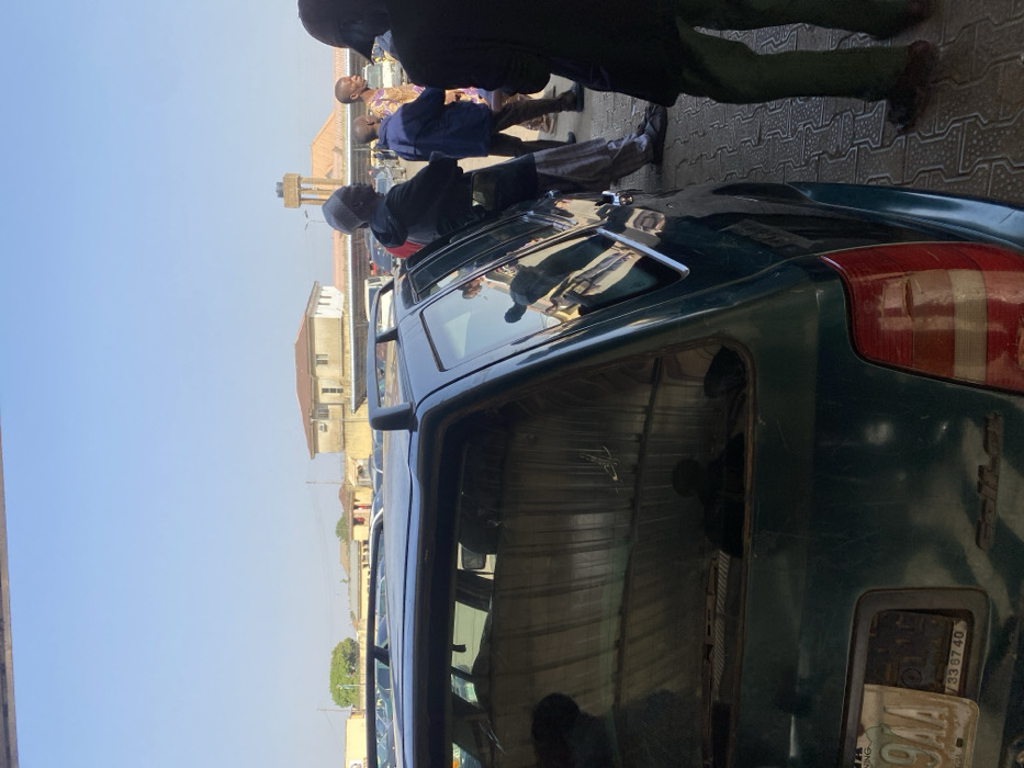 A forensic description of the scene in Bukuru, Plateau State, Nigeria, depicts a daytime outdoor environment. In the immediate foreground, positioned left, is the rear-left quarter of a dark green station wagon. The vehicle has a black roof rack and its rear window displays a visible interior vertical blind or curtain. The Nigerian license plate is affixed to the rear, displaying "PLATEAU STATE" at the top, followed by a partial registration number ending in "9AA," and additional codes "2025 / 33 67 40" below. The vehicle's paint shows dust and minor superficial scratches. To the right of the station wagon, on a paved surface composed of interlocking grey pavers, several individuals are visible. Closest to the viewer on the far right, a person's lower legs and feet, clad in dark trousers and shoes, are partially seen. Further into the mid-ground, a man with a light-colored cap and dark jacket stands with his arms crossed, appearing to lean or stand casually near the vehicle. Behind him and to his right, several other individuals are present, some partially obscured. One person is visible in a blue shirt, and another in a patterned garment. The background features a busy urban or semi-urban landscape under a clear blue sky. A two-story building with a light-colored facade, flat roof, and what appears to be an air conditioning unit is prominent in the middle-distance. To its right, a brown water tower structure with a cylindrical base and elevated tank is discernible. Numerous other parked vehicles are visible in the background, suggesting a parking area or a street with parked cars. The overall scene is illuminated by bright sunlight, casting distinct shadows.