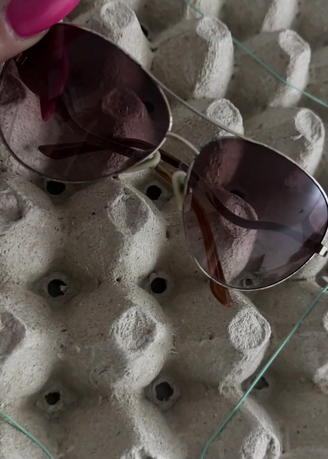 A pair of aviator sunglasses rests on top of a gray cardboard egg carton. A hand with pink nail polish reaches in from the side to adjust the glasses. The egg carton is secured with a thin, green elastic band.