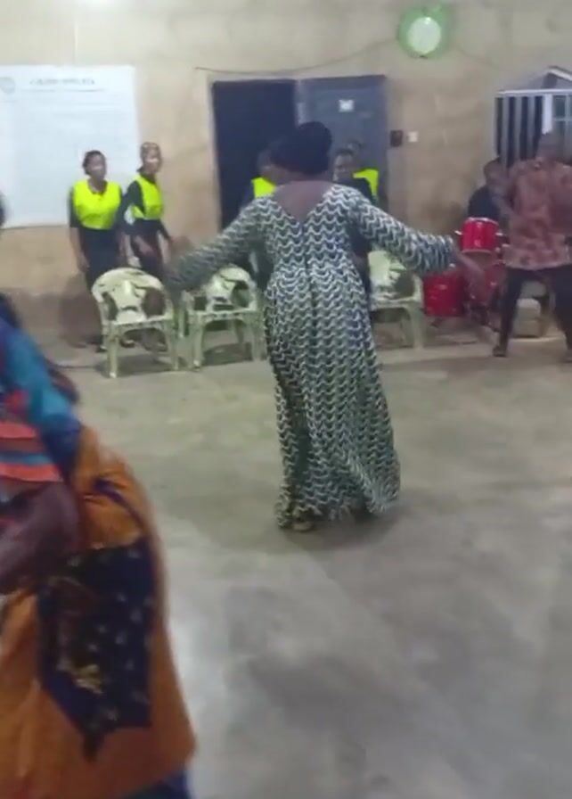 group of people dancing in what appears to be an indoor hall or community center. The walls are plain and the floor is concrete. In the background, there are several chairs, a drum set, and a sign with the words "CAMP RULES" visible on it. Several individuals are dancing, primarily women, dressed in colorful traditional African attire. They move freely, extending their arms and swaying to the music, which is likely originating from the live band set up in the background. The atmosphere seems joyful and celebratory. A man in a blue and white patterned outfit is also dancing. Others are watching, including individuals wearing yellow safety vests.