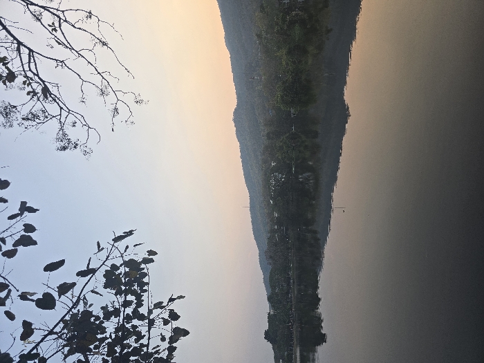 The image captures Ang Kaew Reservoir at Chiang Mai University, within Chiang Mai City Municipality, Thailand, during either dawn or dusk. The upper portion of the frame features a sky transitioning from pale blue overhead to a faint orange-yellow hue near the horizon. Silhouetted tree branches, some with discernible leaves and others bare, frame the top left and top right of the composition, respectively. The central and lower two-thirds of the image are occupied by the calm surface of the reservoir, reflecting the sky and distant landforms. Across the water, a dense line of dark green trees forms the immediate shoreline. Behind this tree line, a range of forested mountains, specifically Doi Suthep, extends across the horizon. Indistinct building structures are partially visible through the trees on the distant bank. A slender, dark pole-like structure, possibly a communication tower, is situated on a distant mountain peak. A single, dark object, consistent with a light pole, is reflected in the water in the mid-ground. No human figures, animals, or active vehicles are visible.
