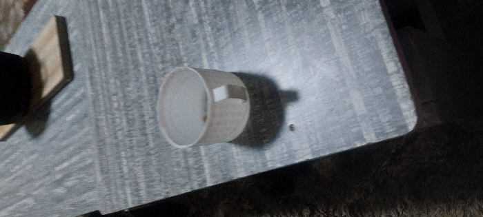 A white cylindrical container sits on a grey patterned surface, casting a shadow to the right. A small piece of tape is affixed to its exterior. To the left, a wooden plank supports a dark, cylindrical object. The background appears to transition into a darker, shadowed area.