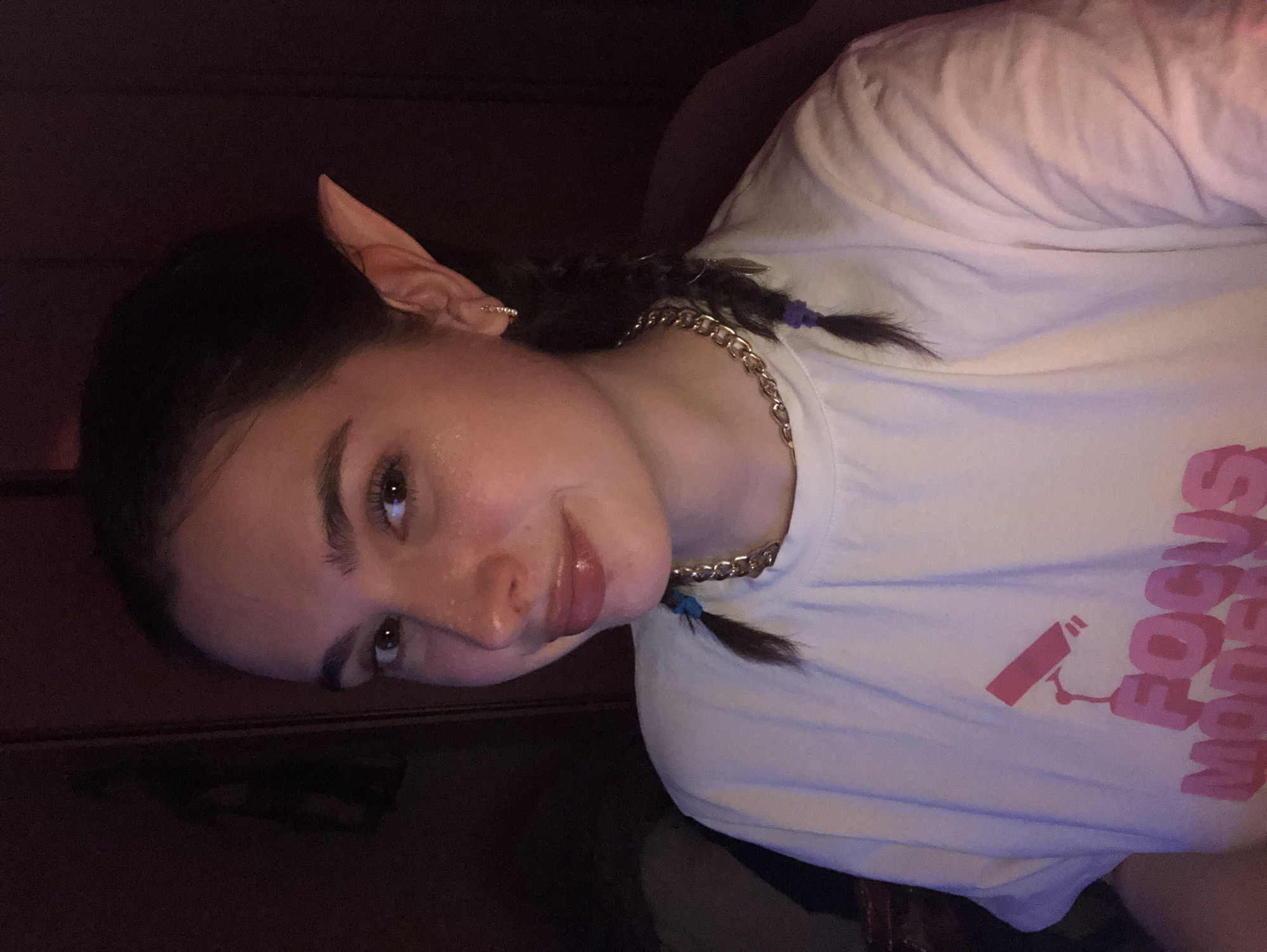 A fair-skinned person is seen in a dimly lit indoor setting, with dark furniture visible in the background. They are wearing a white t-shirt with pink lettering and an illustration resembling a security camera, and a gold-colored chain necklace. Their dark hair is styled in two braids secured with blue ties. The person has pointed, elf-like ears, suggesting a costume or cosplay element. The photograph is taken at an angle, and the surroundings are not clearly defined, making it difficult to determine the specific location. There is no verifiable indication of Noviy, Russia.