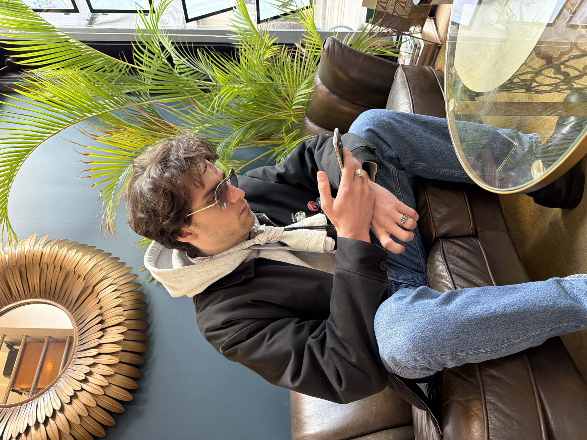 A young man is reclining on a dark leather sofa, holding a smartphone in his right hand. He is wearing light blue jeans, a gray hoodie, and a black jacket. He has sunglasses on his face and rings on his fingers. To the left of the sofa is a large, ornate, golden mirror on a blue wall. A large potted palm plant is behind the man on the sofa. A round glass table is adjacent to the sofa. The lighting is bright and suggests an indoor environment. The location is most likely a stylish apartment or office space and not on the streets of Paris. There are no signs to suggest this location is Paris.