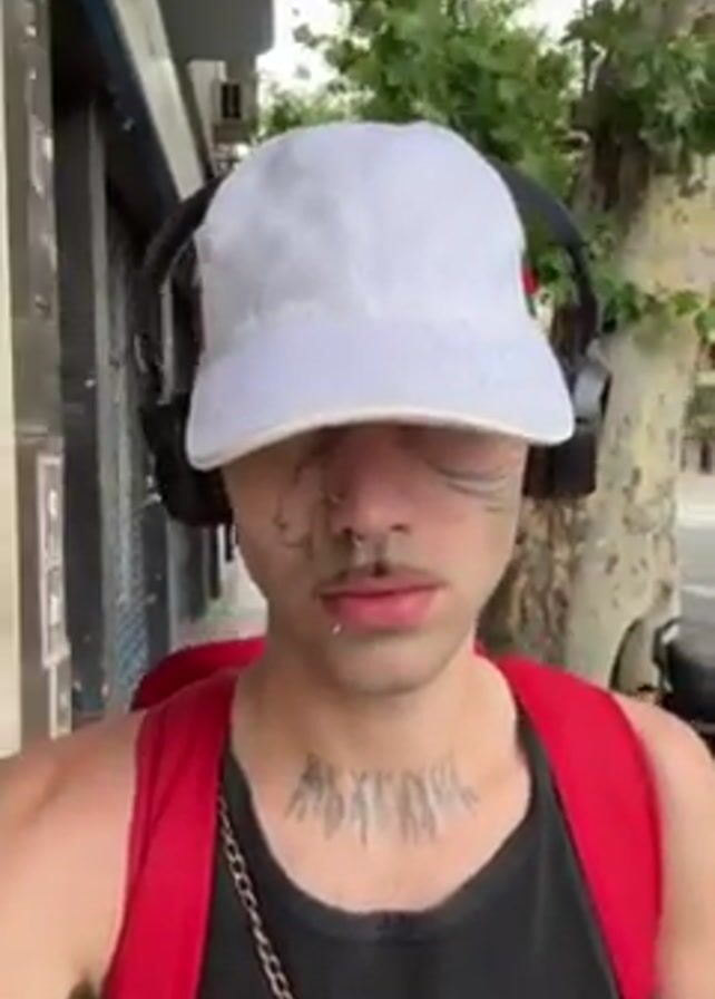 A young person wearing a white cap, headphones, a black tank top, and a red backpack is walking along a city sidewalk. The person has tattoos on their face and neck and appears to be holding a brown paper bag with writing on it. The background includes buildings, a tree, and a street with passing cars. The camera is held at approximately eye level, and the person is looking directly at the camera.