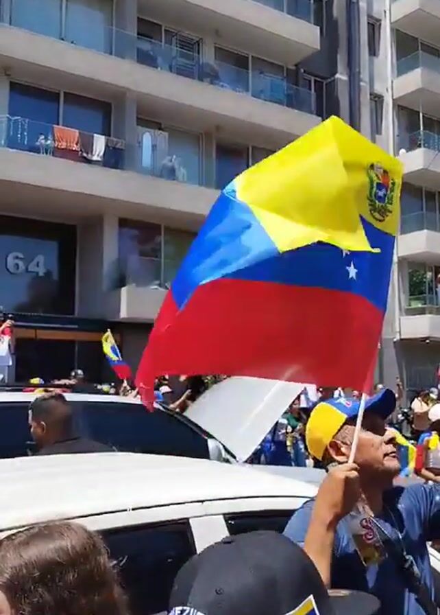 daytime street scene with a crowd of people, many of whom are waving the flag of Venezuela. They appear to be gathered near or around several white cars. One man is holding a can of "Sol" brand beverage and waving a flag. The buildings in the background are modern apartment blocks with balconies. The atmosphere seems festive and patriotic.