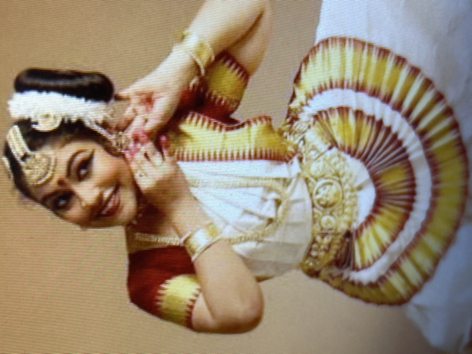 The image displays a female individual adorned in traditional Indian classical dance attire and elaborate jewelry, positioned against a plain, light-colored background
