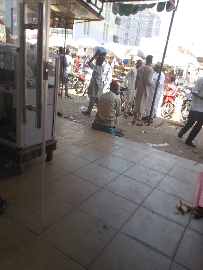 The image captures a street scene in the city of Maiburiji, Nigeria, viewed from inside an establishment