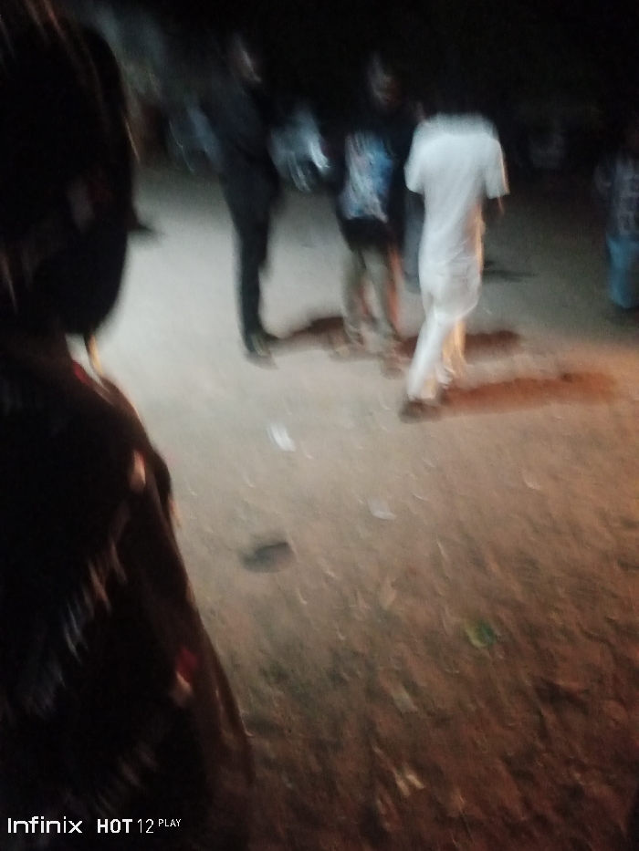 A blurry, low-quality image shows a group of people standing on what appears to be a dirt road at night
