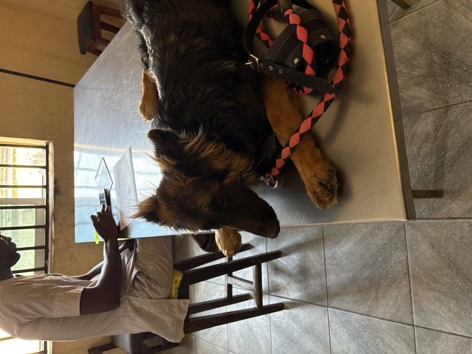The image depicts an indoor scene within a facility in Bukuru, Nigeria. A dark-skinned individual, wearing a light-colored, striped short-sleeved top and light pants, is seated on a wooden stool with a yellow cushion. The individual is positioned on the left side of the frame, facing a window secured with a metal grill, and is engaged with a smartphone in their right hand and a yellow pen in their left, with a document visible on the table. In the foreground, a German Shepherd-type dog, exhibiting black and tan fur, lies calmly on a stainless steel examination table. The dog's head is oriented towards the left. It wears a dark collar, and a red and black braided leash, along with a black harness, is coiled on the table near its front paws. The room features light-colored walls and a floor covered with grey square tiles. Natural light illuminates the scene, primarily from the window.