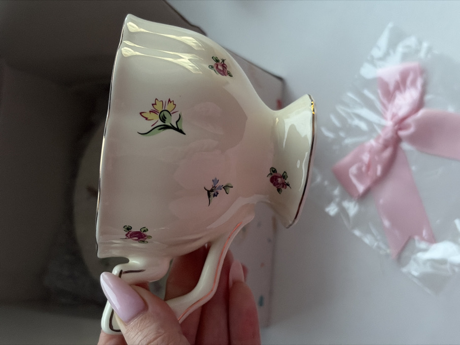 An overhead, close-up image depicts a person's hand holding a cream-colored ceramic teacup decorated with floral patterns, presented in the context of Novosaratovka, Russia. The teacup features a footed base and a single handle, both accented with gold-colored trim, as is its scalloped rim. Scattered across the teacup's surface are various small flowers, including pink roses, a larger yellow bloom with a green stem, and a small blue/purple flower. The hand holding the teacup has manicured fingernails with light pink polish. In the background, a white box with faint colorful patterns is partially visible, containing another white object, likely a saucer. In the foreground, below and to the right of the teacup, a clear plastic bag containing a pink satin bow is present on a white, reflective surface.